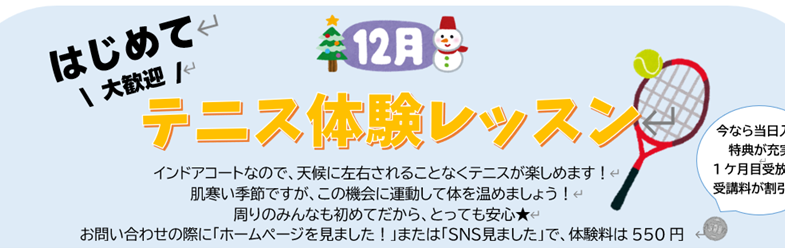 - 2025年12月 初心者テニス体験会開催! 運動不足が気になる季節、テニスをはじめませんか?? オレンジフィールドはインドアコートなので、 紫外線や雪を気にすることなくテニスを楽しめます! テニス体験会では、周りのみんな […]
