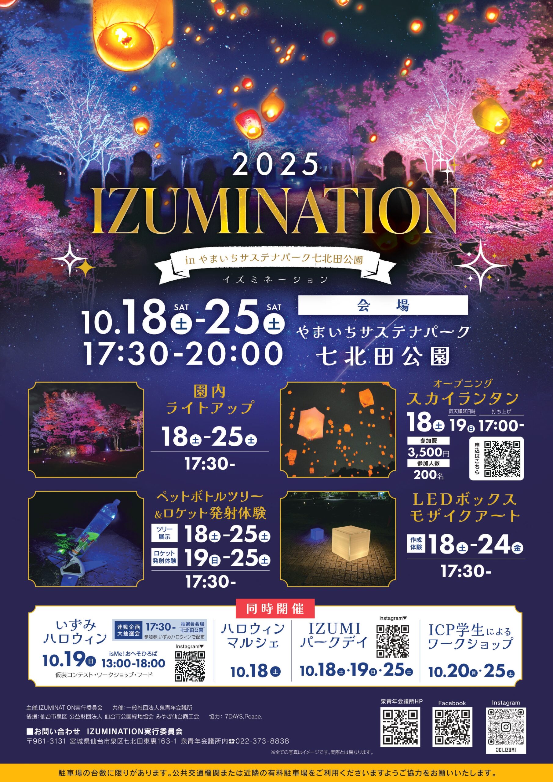 例年開催されております、IZUMINATION inやまいちサステナパーク七北田公園は、本年で5回目を迎え、やまいちサステナパーク七北田公園を鮮やかなライトアップで幻想的な空間をお楽しみいただけます。