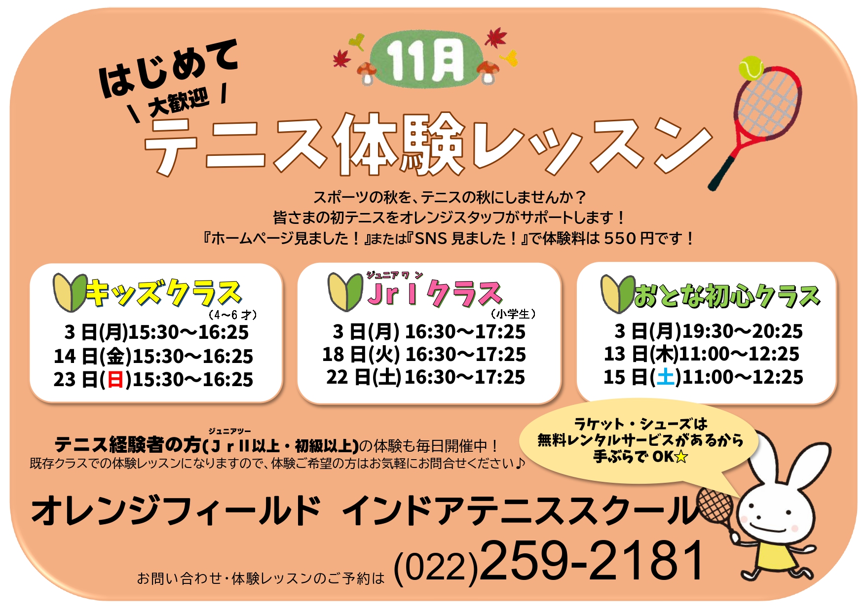 - 45周年記念!夏の入会キャンペーン! オレンジフィールドでは 皆さんの新しいスタートを応援します! この機会に是非、テニスを体験してみてください♪ 問合せ・お申込は電話 022(259)2181 問合せ・お申込は電話 […]