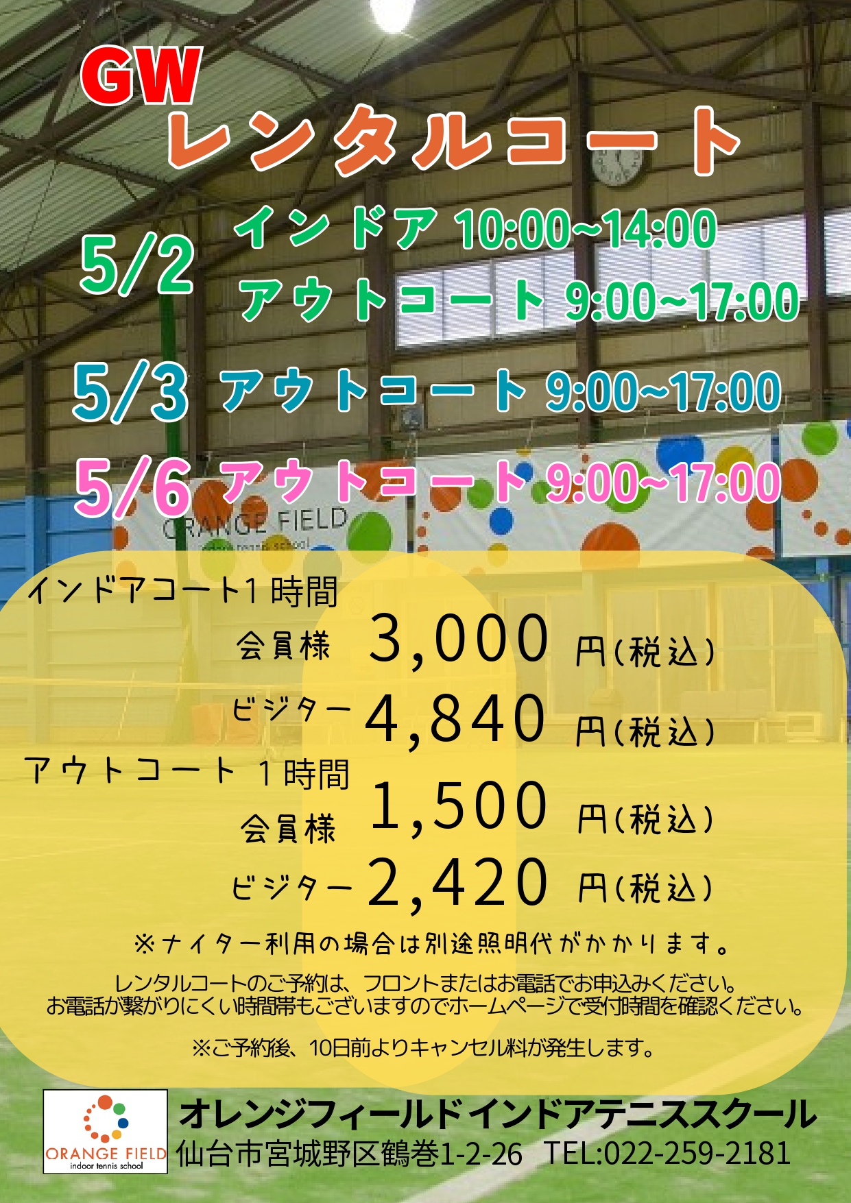 - 45周年記念!入会キャンペーン! オレンジフィールドでは 皆さんの新しいスタートを応援します! この機会に是非、テニスを体験してみてください♪ 問合せ・お申込は電話 022(259)2181
